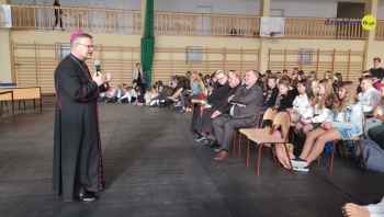 — Bardzo się cieszę, że mogę być razem z Wami. Wasza szkoła jest wyjątkowa, ponieważ obraliście sobie za patrona Św. Jana Pawła II. Przyjmujemy patrona po to, by był dla nas przewodnikiem. Jan Paweł II zostawił nam bardzo dużo przesłań, encyklik, bardzo dożo cennych słów. Naszym zadaniem jest sięgać po Jego nauki — powiedział biskup Wiesław Śmigiel. — Pamiętajcie, że w szkole nie tylko uczymy się, zdobywamy wiedzę, ale jest to także czas, kiedy uczymy się żyć. W tej szkole bardzo harmonijnie łączycie naukę i życie duchowe.